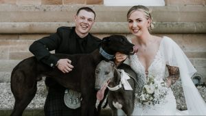 A retired greyhound stole the show on an Airdrie couple’s wedding day after his surprise appearance outside of church brought the...