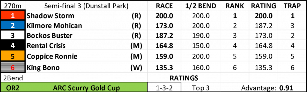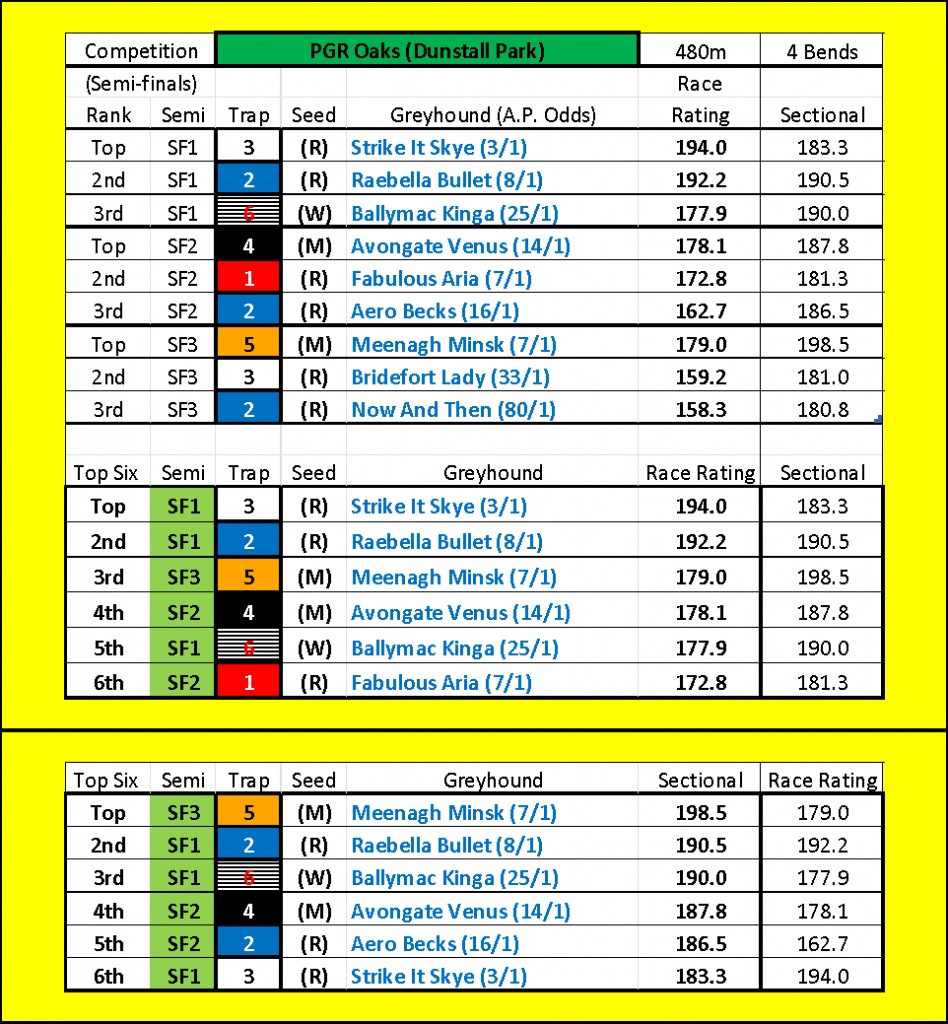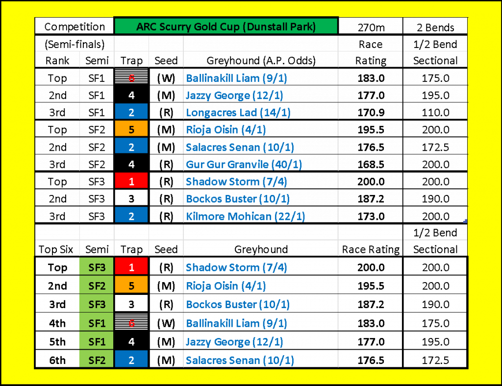Sadly, Kelvins Hat has since had to be withdrawn from the semi-finals. Raebella Bullet managed to overhaul Meenagh Minsk in apparently the slowest four-bend winner on the night.