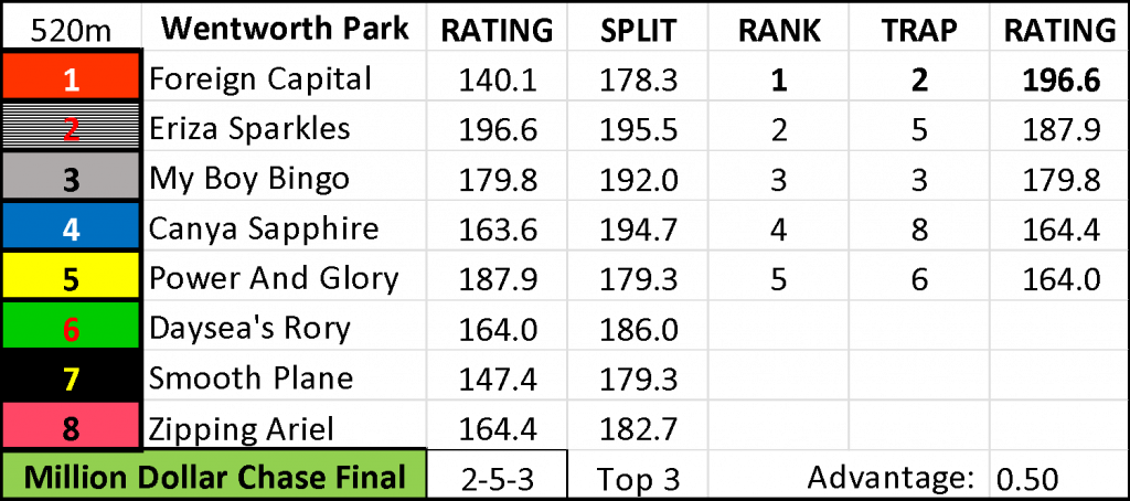 The ratings have also been calculated for the Ladbrokes Million Dollar Chase at Wentworth Park in Australia, the richest greyhound race in the world!