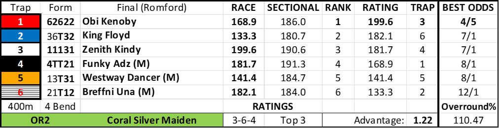 The other qualifiers were Out The Blue, who always led with the favourite Silverhill Adam running on well, with the Mark Wallis kennel achieving half the field in contesting the final.
